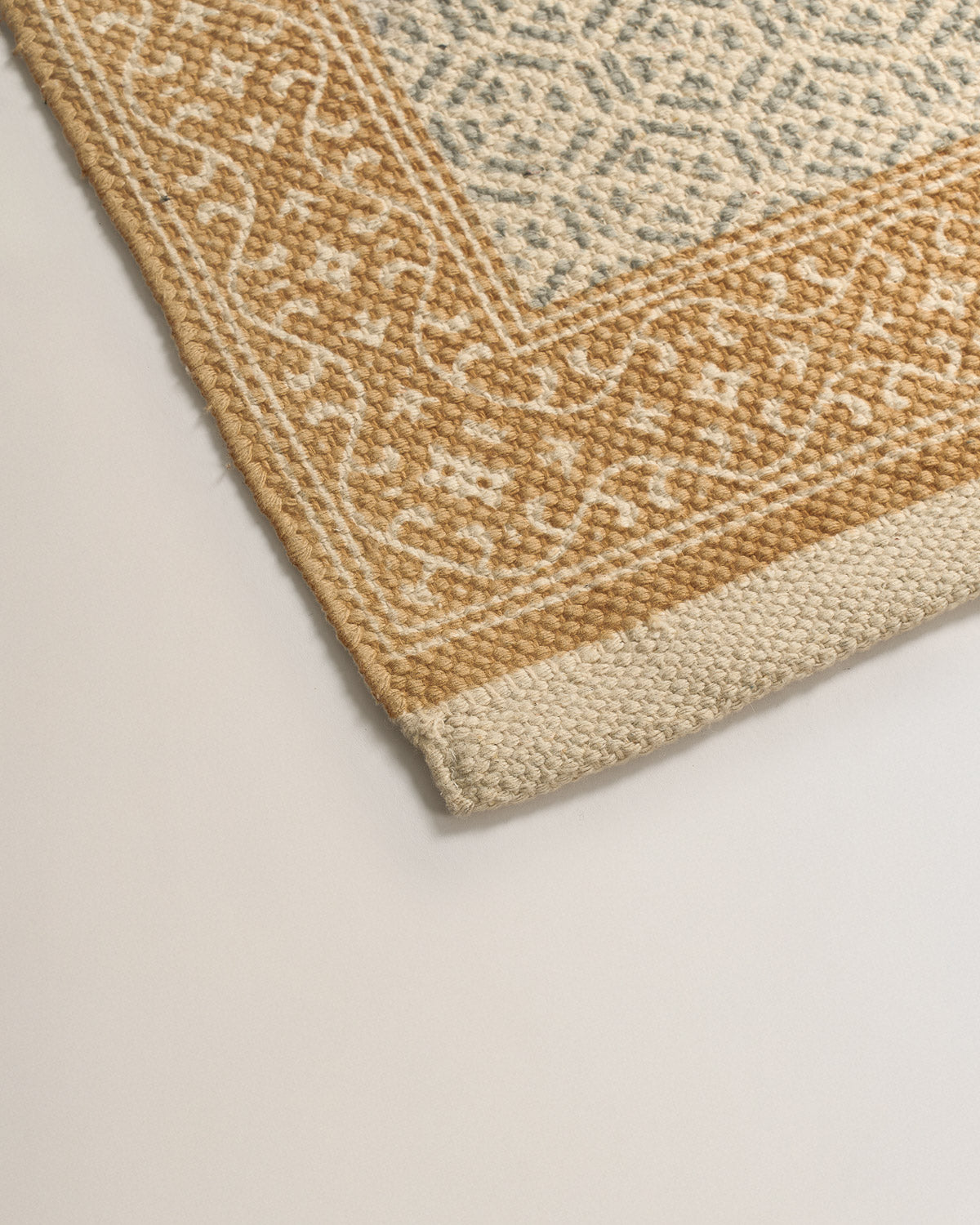 Alfombra confeccionada en algodón con diseño geométrico en jacquard y efecto artesanal.