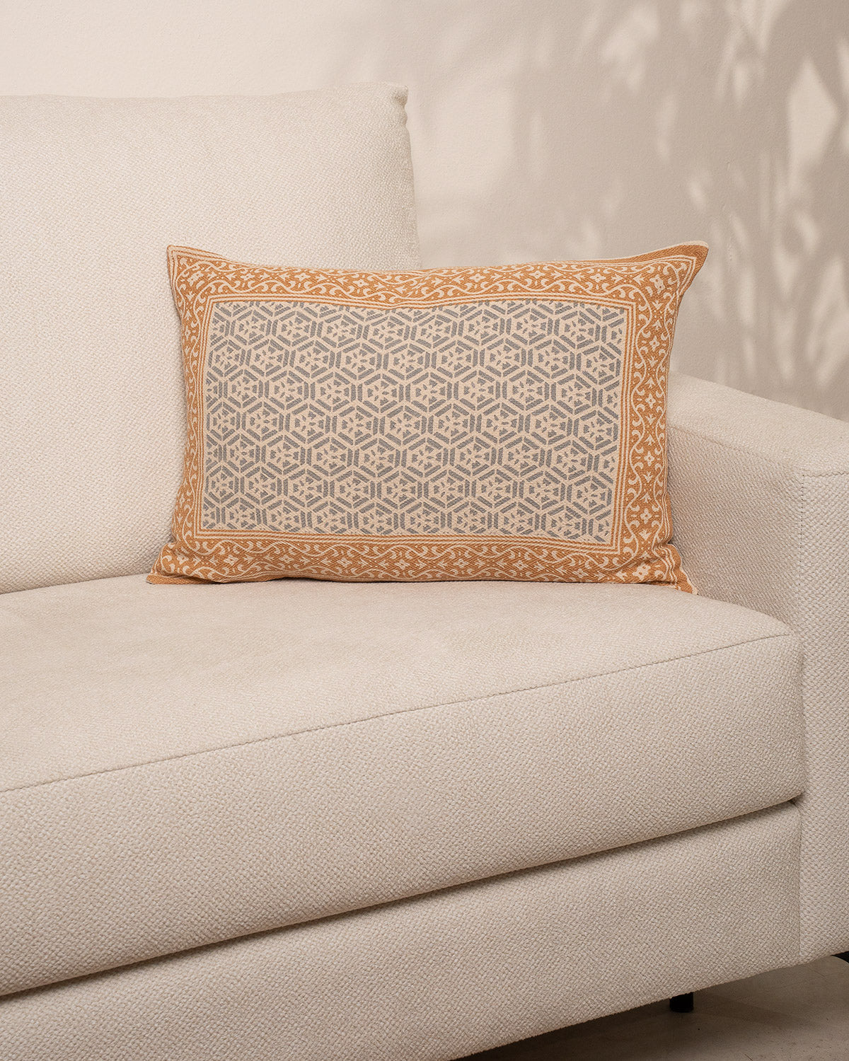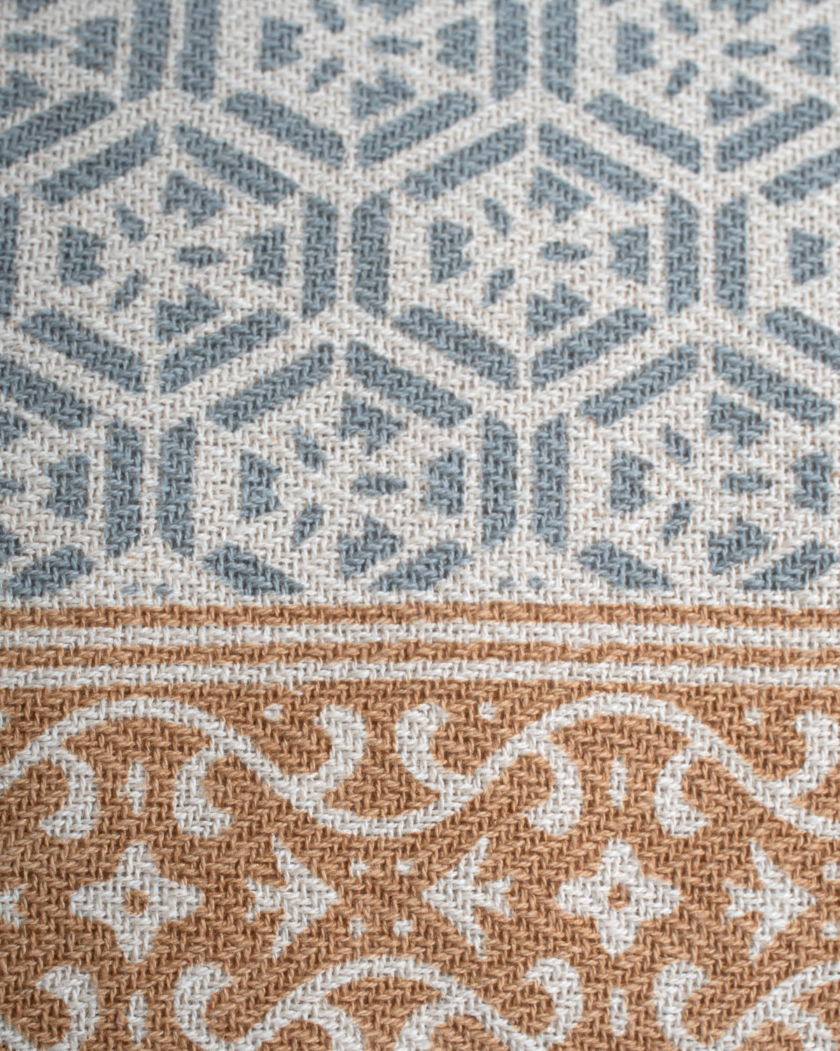 Cojín confeccionado en algodón con diseño geométrico en jacquard y acabado de inspiración artesanal.