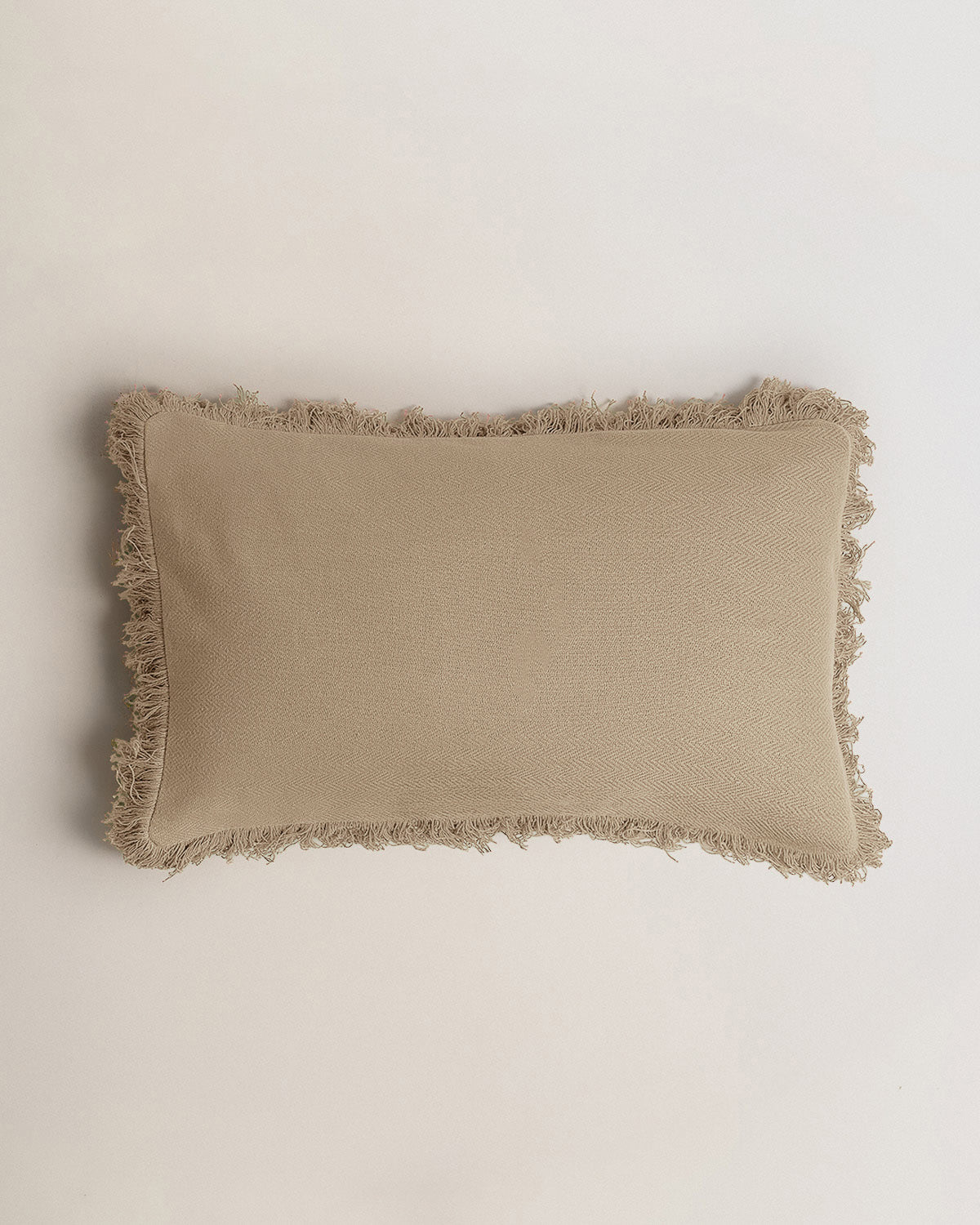 Cojín confeccionado en algodón liso rematado con flecos en el contorno.