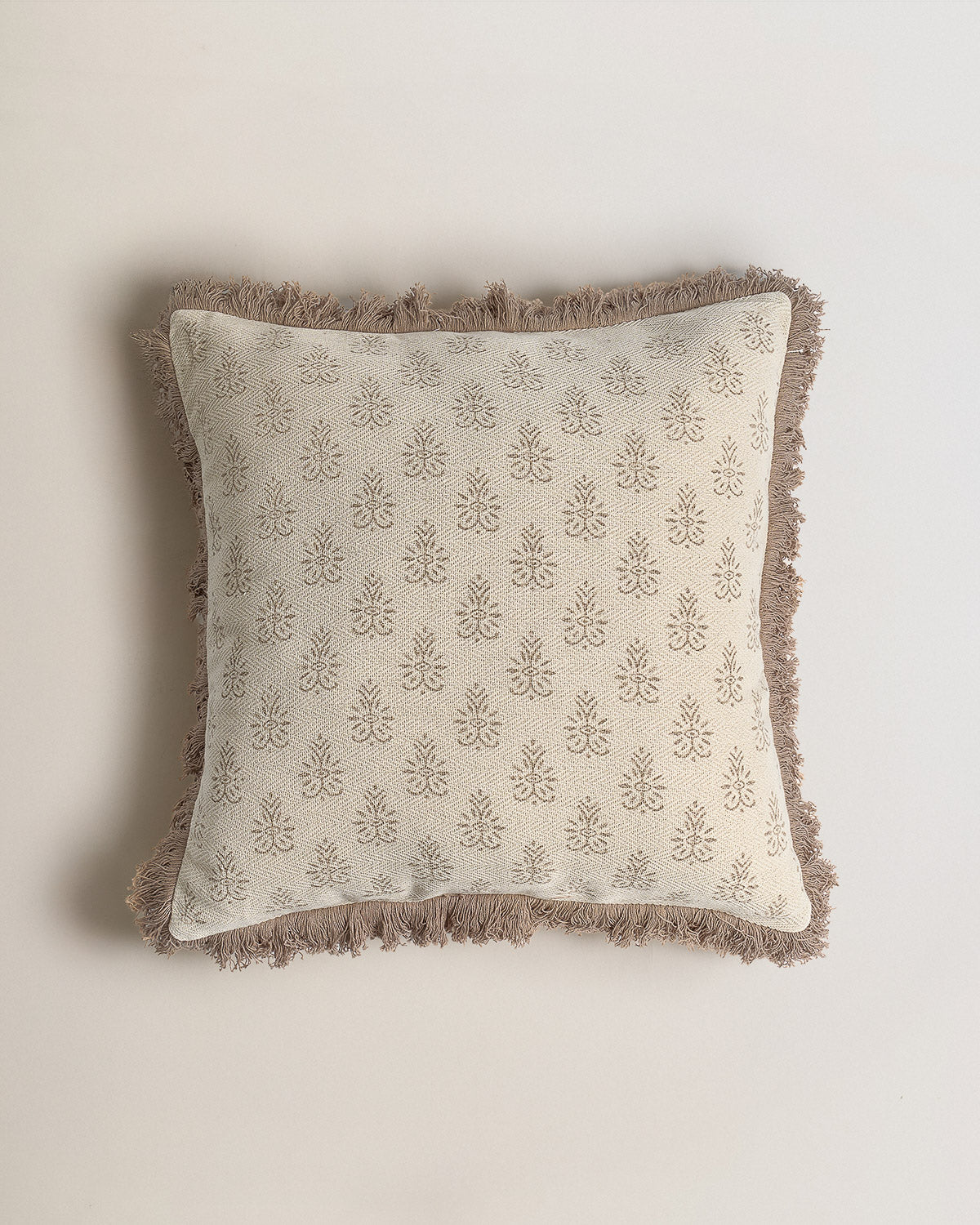 Cojín confeccionado en algodón. Estampado floral rematado con flecos en el contorno.