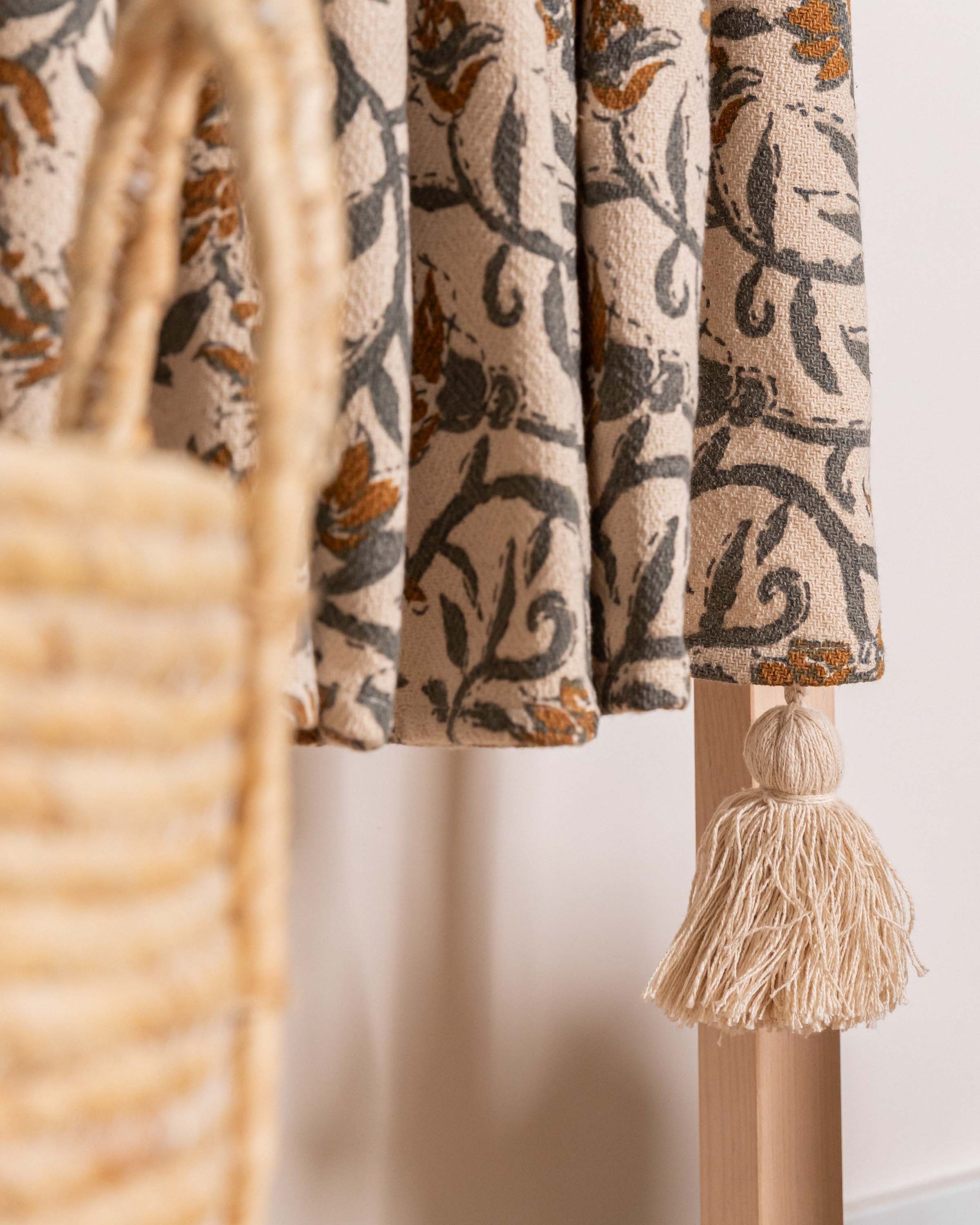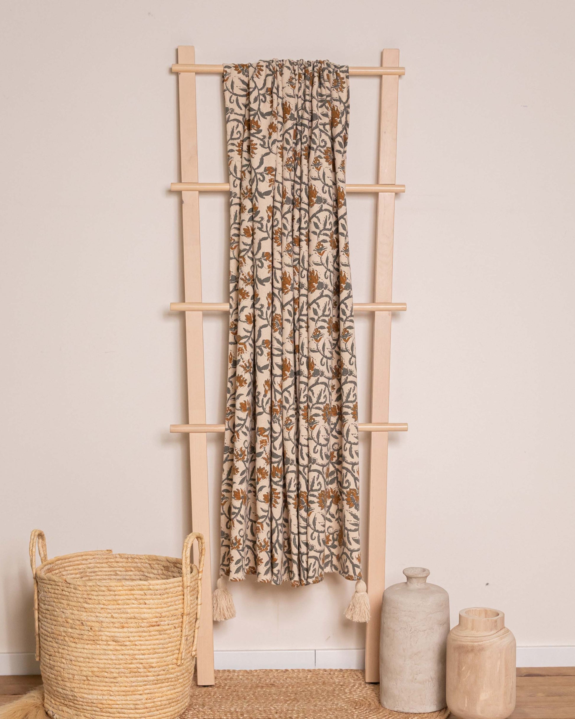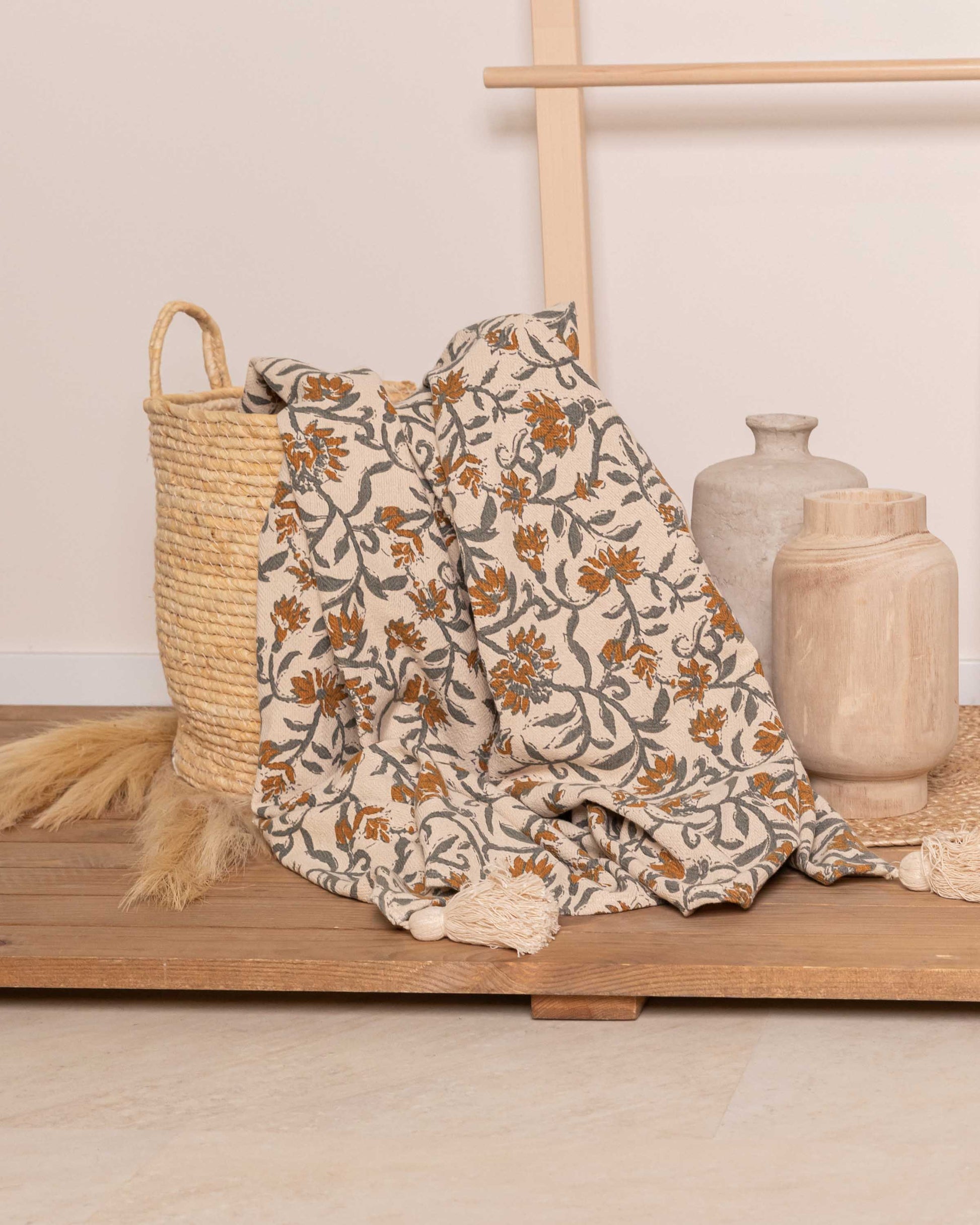 Plaid de algodón 100% con diseño floral en tonos ocre y verde. Perfecto como manta ligera para el sofá o a los pies de la cama. Suavidad, estética y funcionalidad en un accesorio decorativo imprescindible.